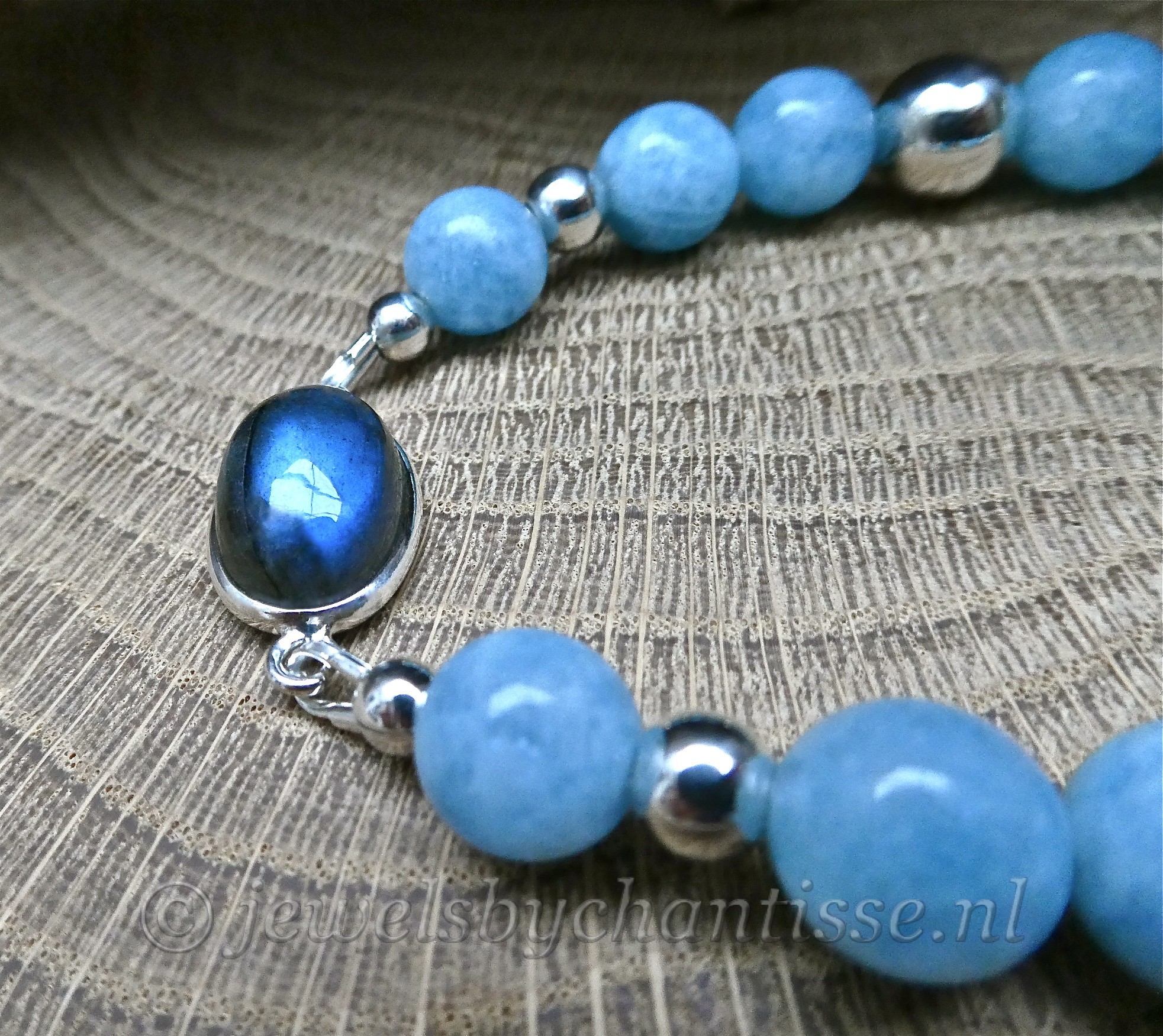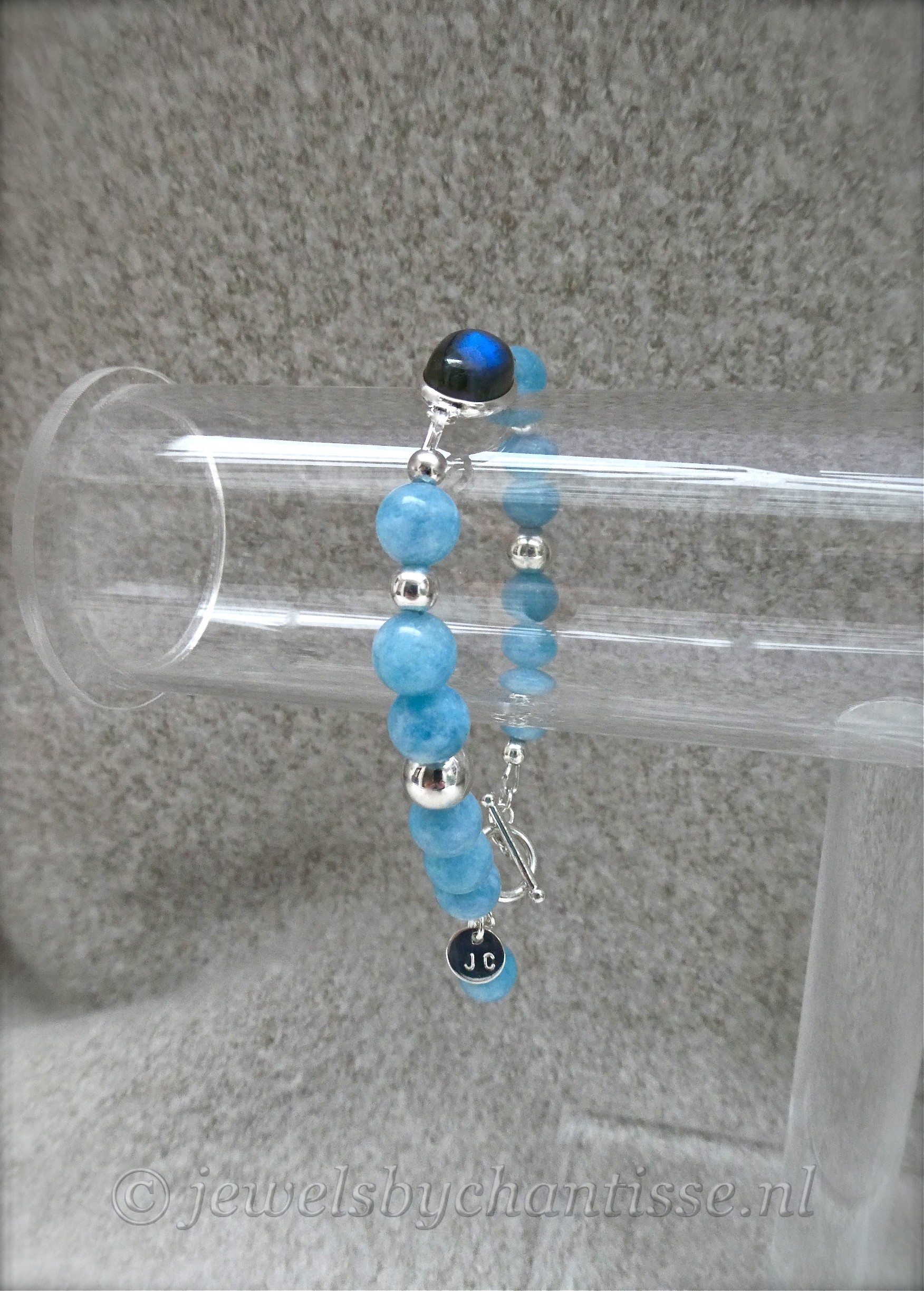 Deze sterling zilveren armband van aquamarijn en labradoriet is een opvallende verschijning. De aquamarijn kralen zijn van AA-kwaliteit en hebben een diepe warme lichtblauwe kleur. Het ornament in het midden van de armband is een labradoriet, cabuchon geslepen met een helder blauwe kleur gezet in een zilveren rand. De armband heeft een kapittelslot als sluiting. De aquqmarijnkralen zijn 8 mm groot en de armband is 20 cm lang. Een originele en unieke armband!