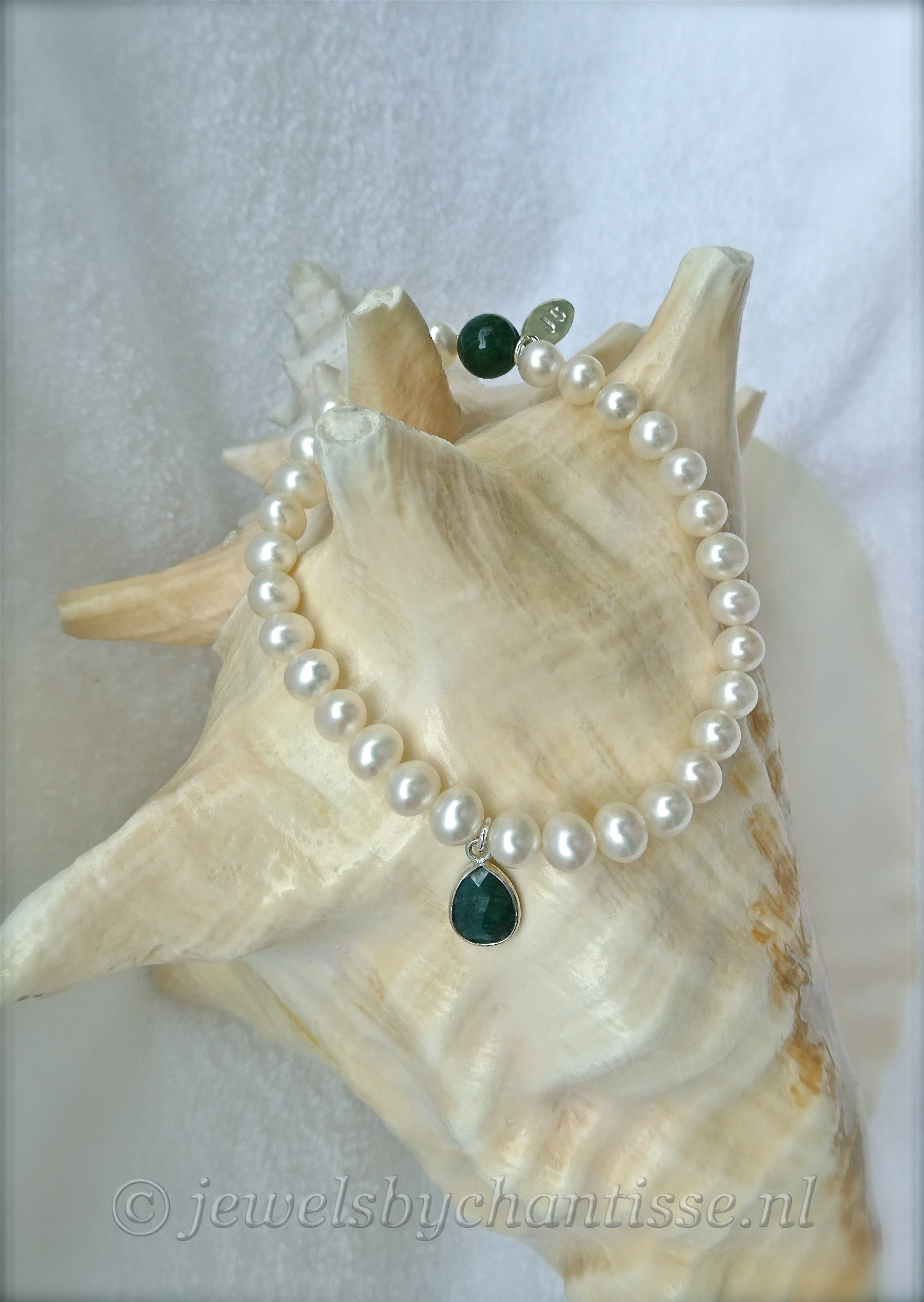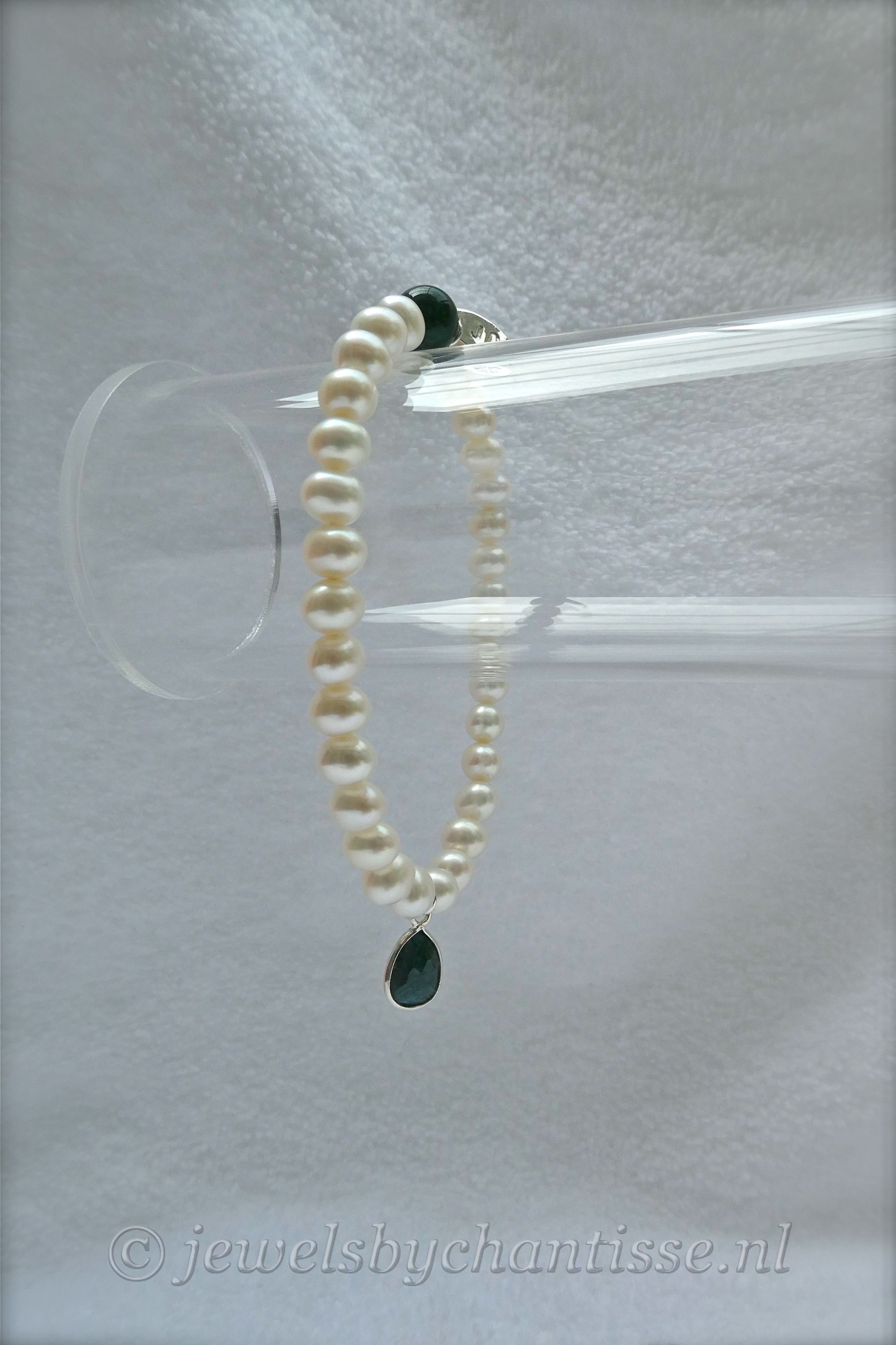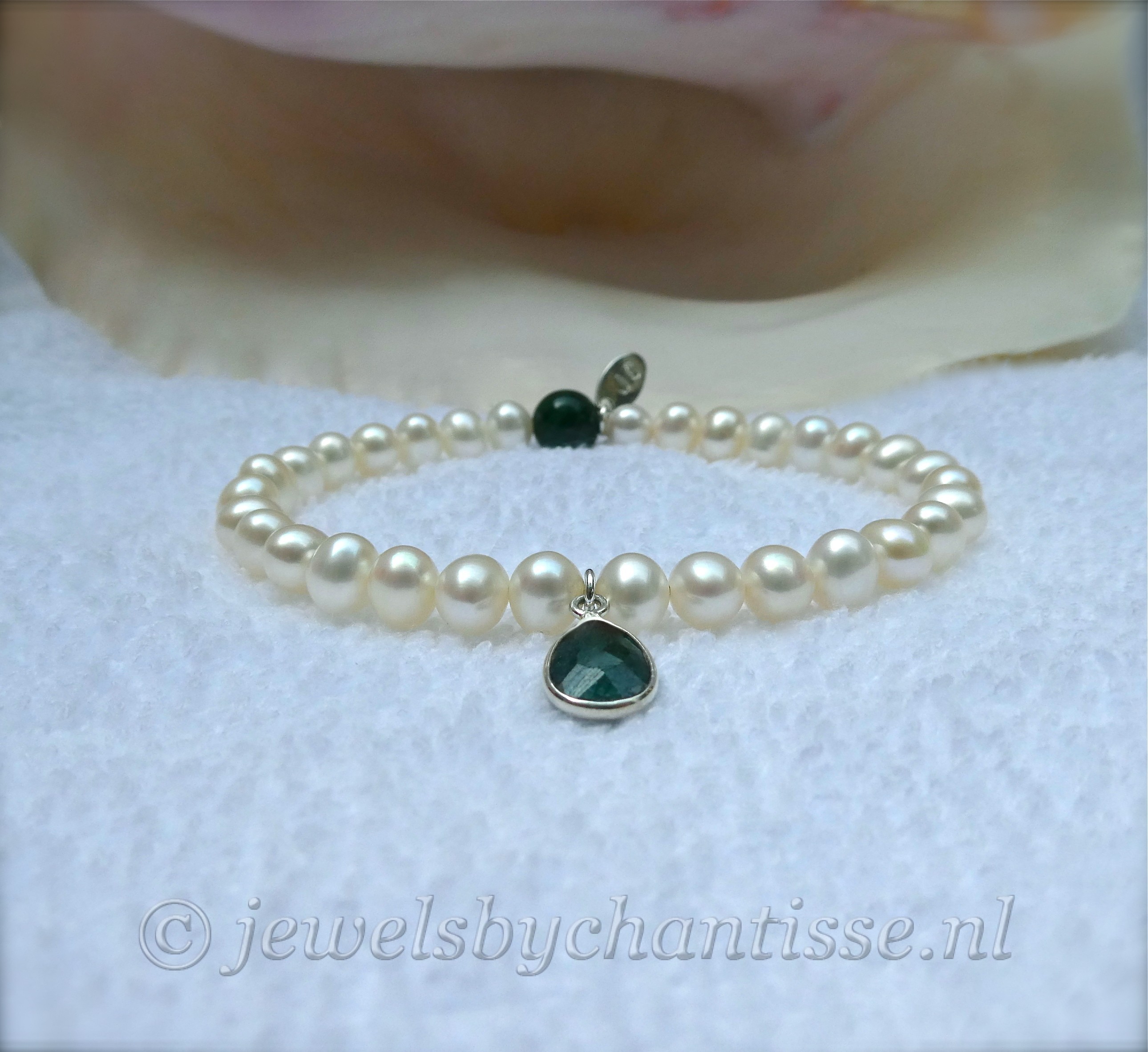 Mooi en fijn elastisch AA-kwaliteit zoetwaterparel armbandje, met in het midden een facetgeslepen ruw smaragd hangertje gezet in een sterling zilveren rand. Modern met een chique uitstraling. De armband is 19 cm en voorzien van een Jewels by Chantisse label met daarnaast een malachiet kraal. De pareltjes hebben een schitterend luster, zijn iets ovaal en 6,5 x 6 mm groot. De smaragd is druppelvormig en 12 x 8 mm groot. Een fijn, tijdloos, uniek en chique armbandje wat overal bij past en je het hele jaar kan dragen. Ook verkrijgbaar met een ruwe saffier. (zie foto’s)