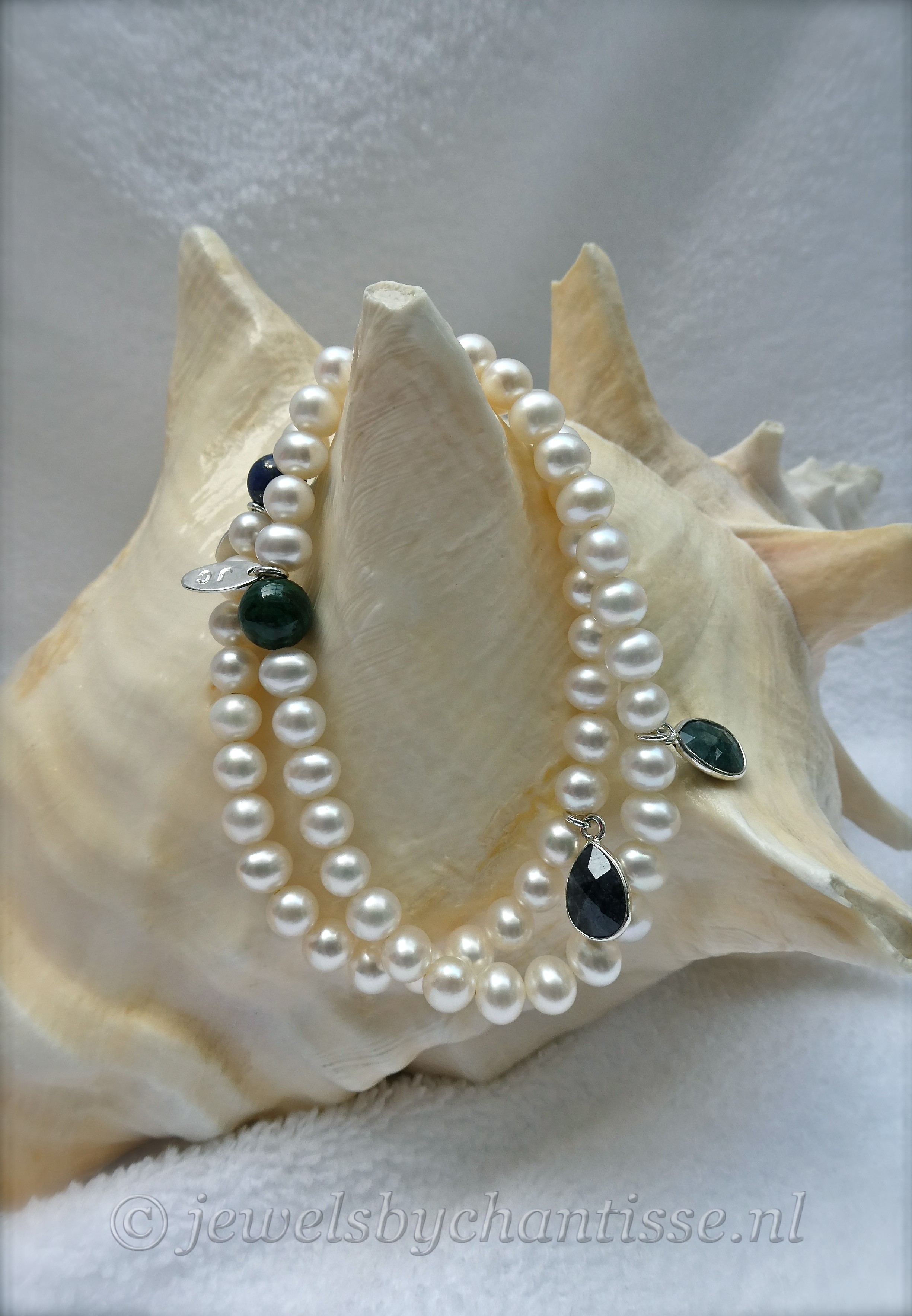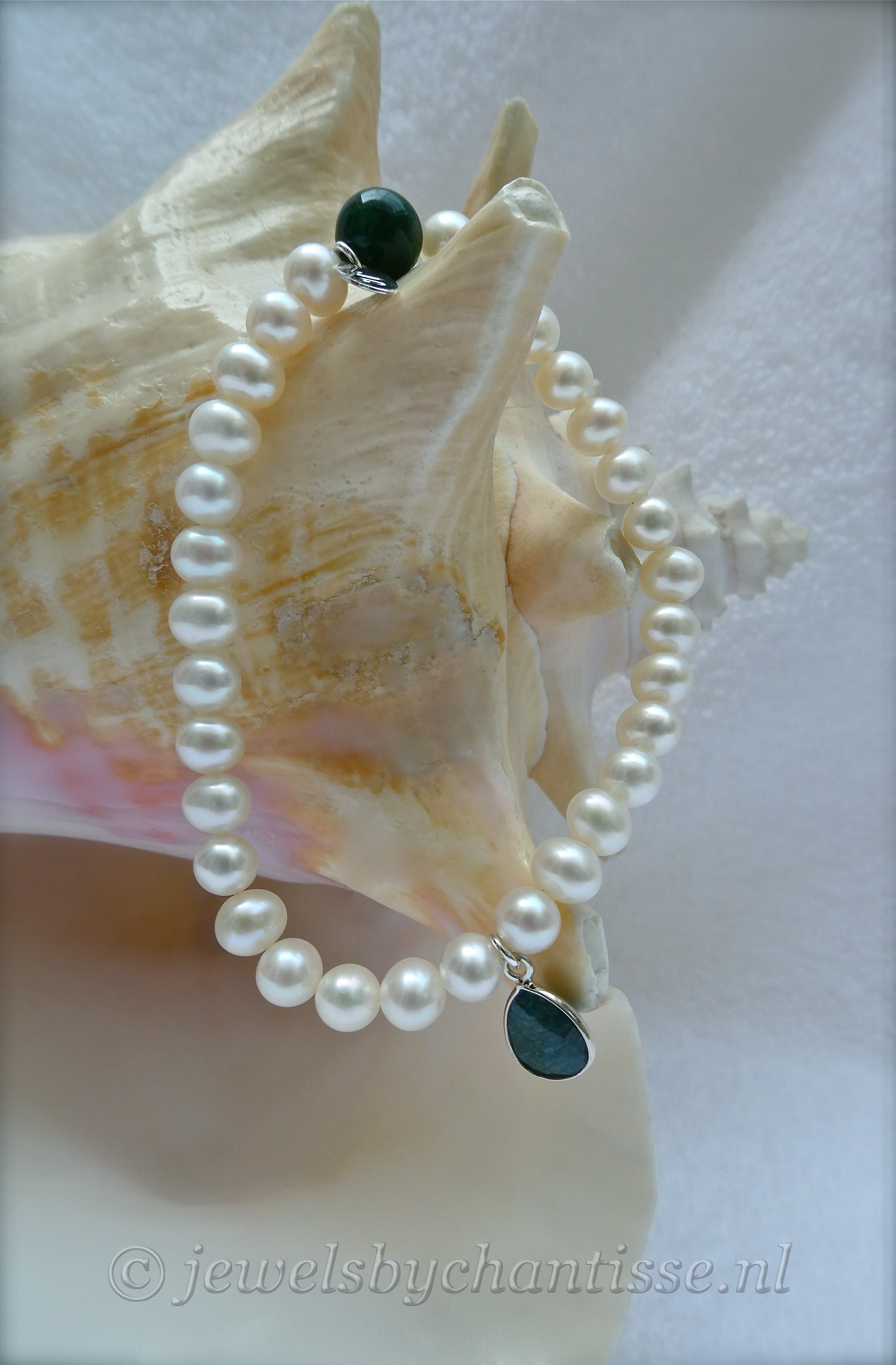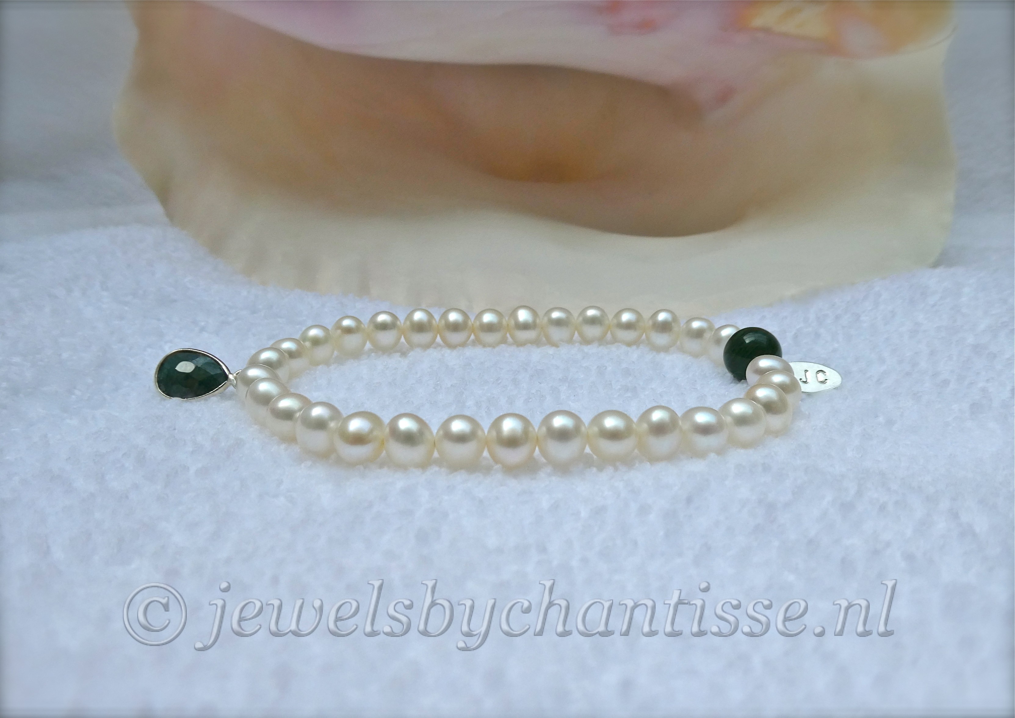 Mooi en fijn elastisch AA-kwaliteit zoetwaterparel armbandje, met in het midden een facetgeslepen ruw smaragd hangertje gezet in een sterling zilveren rand. Modern met een chique uitstraling. De armband is 19 cm en voorzien van een Jewels by Chantisse label met daarnaast een malachiet kraal. De pareltjes hebben een schitterend luster, zijn iets ovaal en 6,5 x 6 mm groot. De smaragd is druppelvormig en 12 x 8 mm groot. Een fijn, tijdloos, uniek en chique armbandje wat overal bij past en je het hele jaar kan dragen. Ook verkrijgbaar met een ruwe saffier. (zie foto’s)