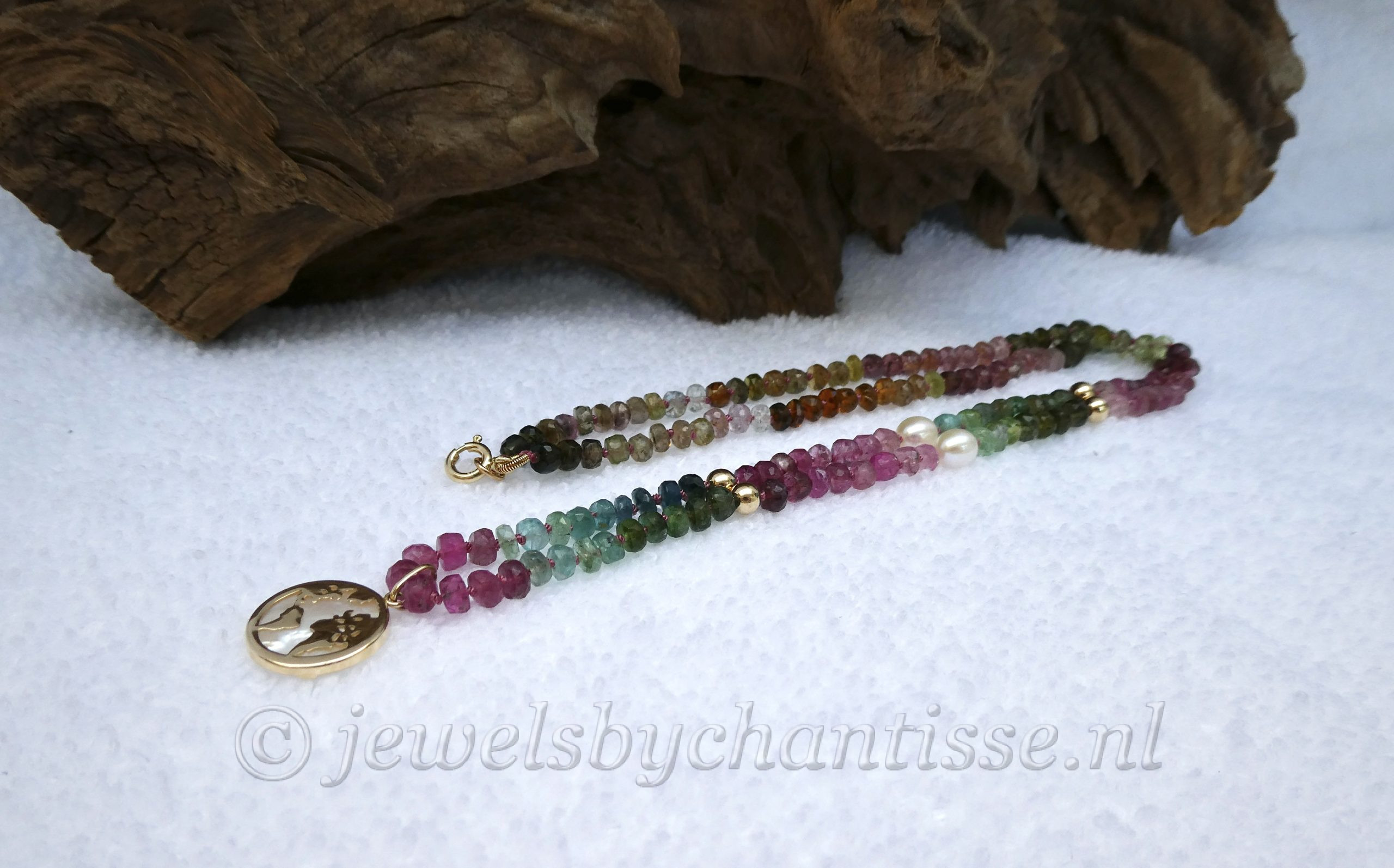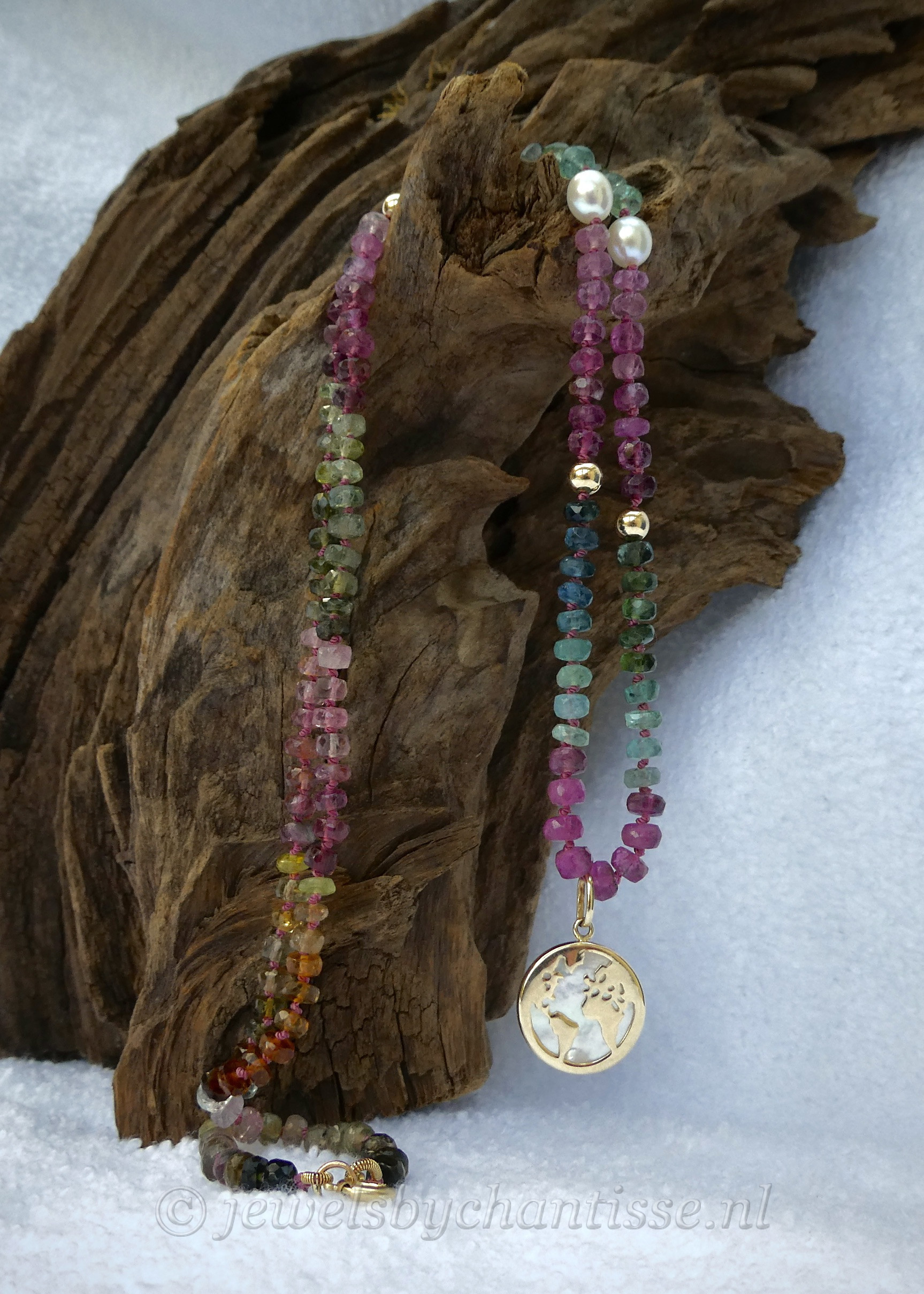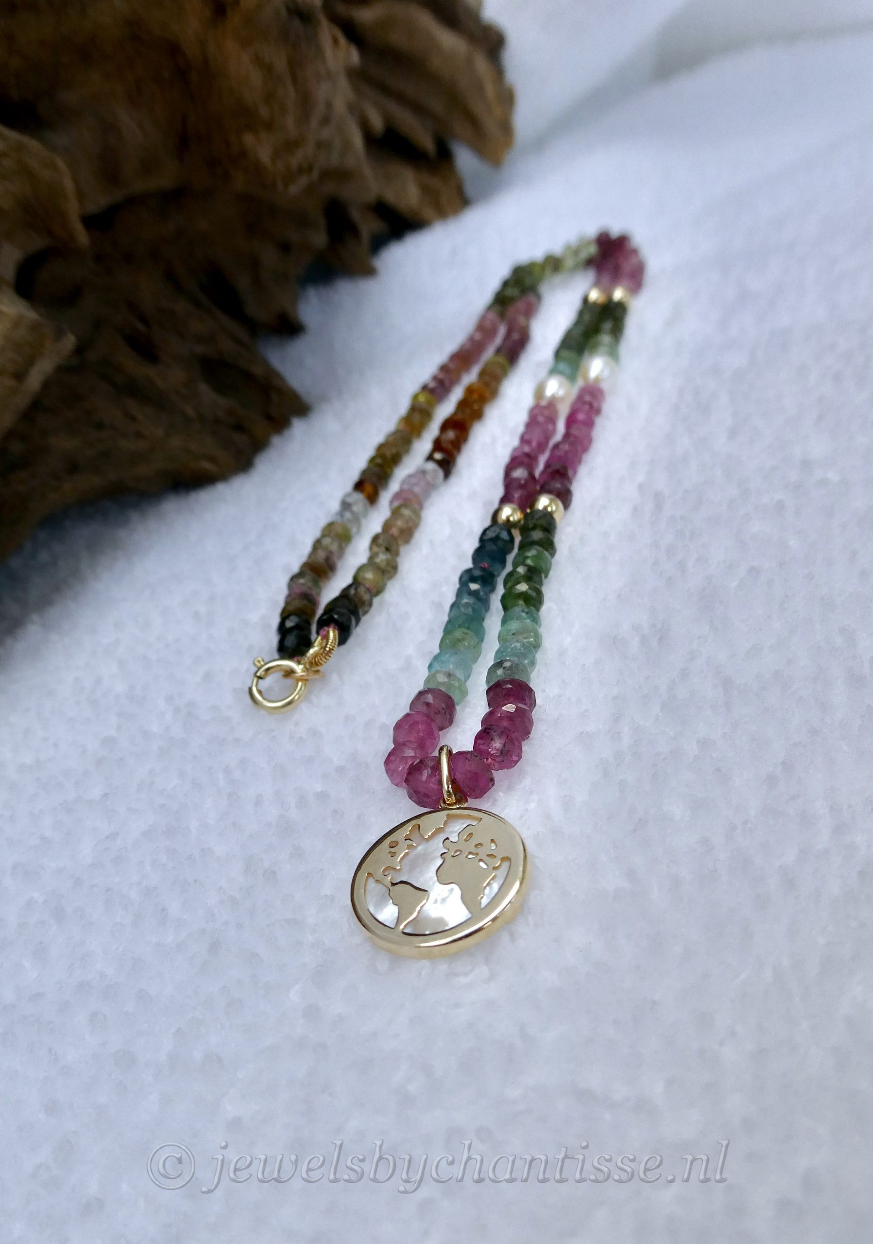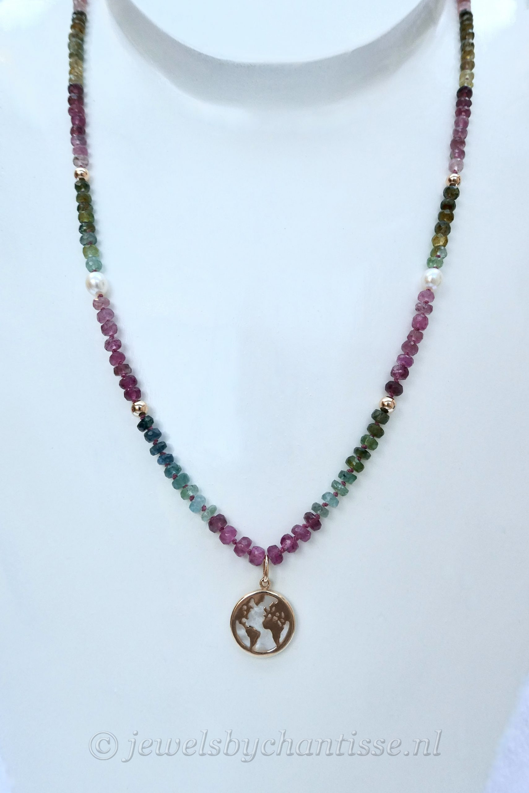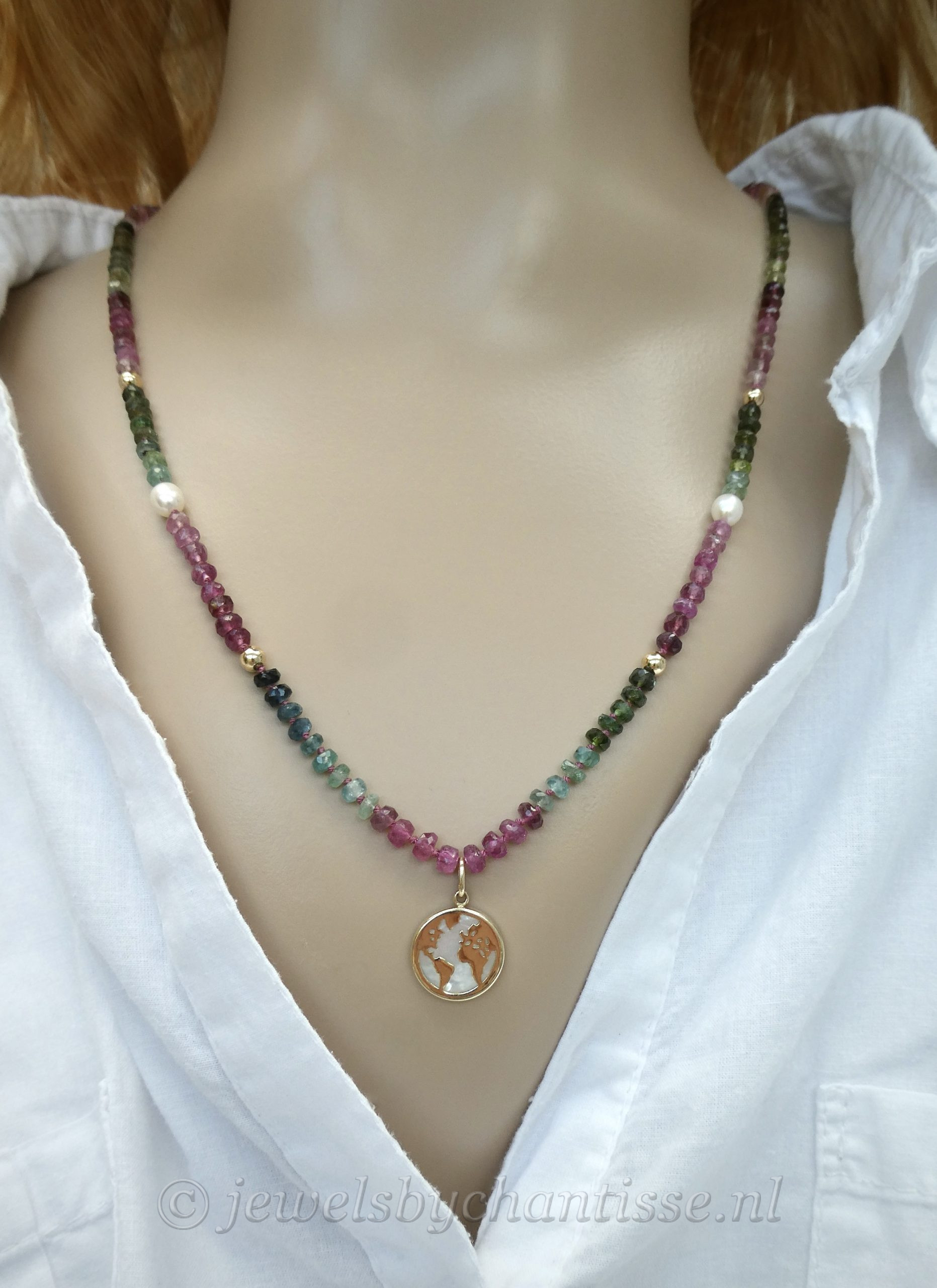 Prachtig handgeknoopt facetgeslepen AA-kwaliteit tourmalijncollier met een wereldbolhanger van 14 krt geelgoud met parelmoer. Het collier is verfraaid met pareltjes en geelgouden bolletjes en heeft een veerring als sluiting. Het collier is 50 cm lang, de steentjes zijn 4 mm en het hangertje is 13,5 mm groot. Een uniek collier wat zowel in de zomer als winter kan worden gedragen en goed is te combineren met andere gouden kettinkjes. TIJDELIJK UITVERKOCHT!