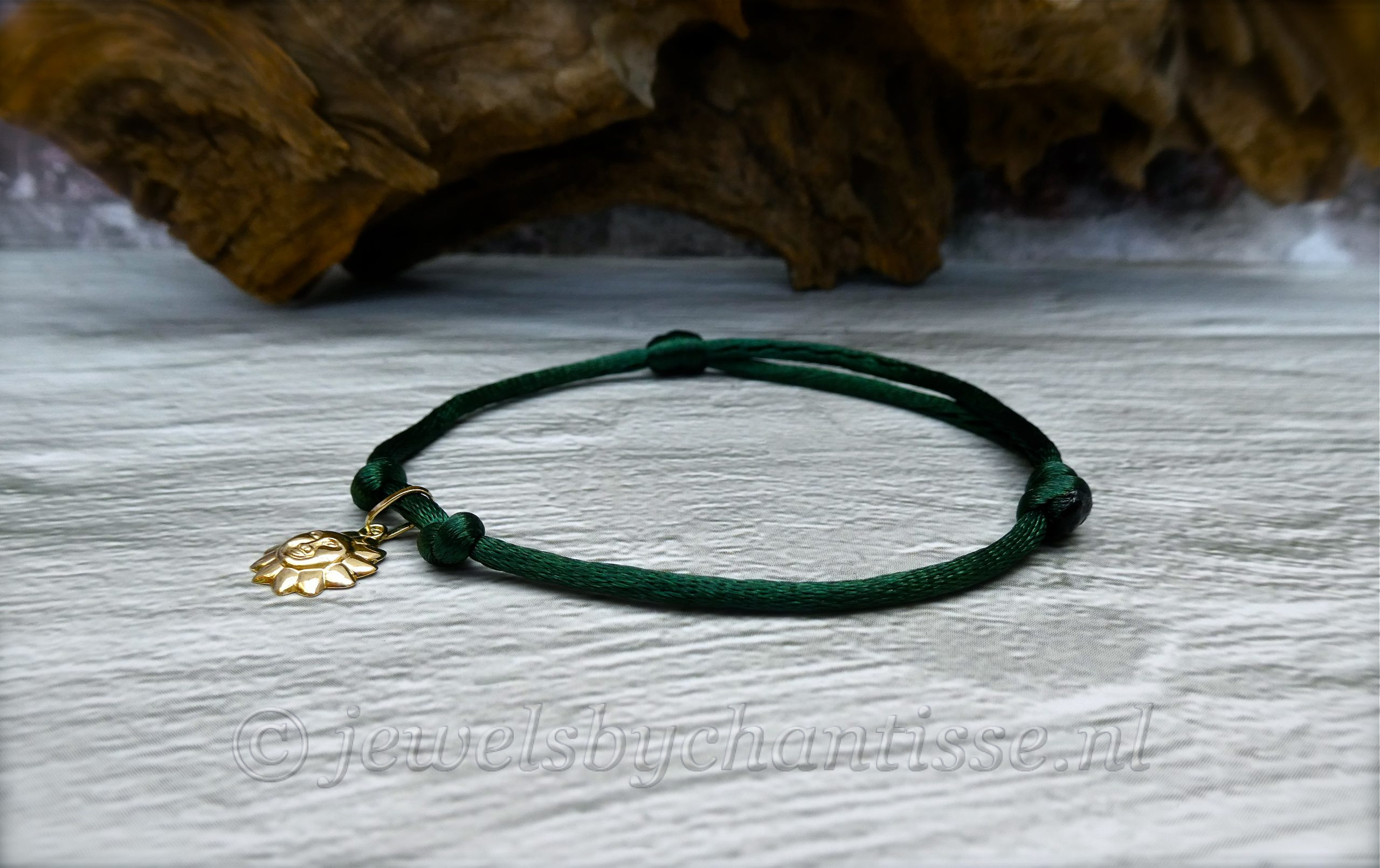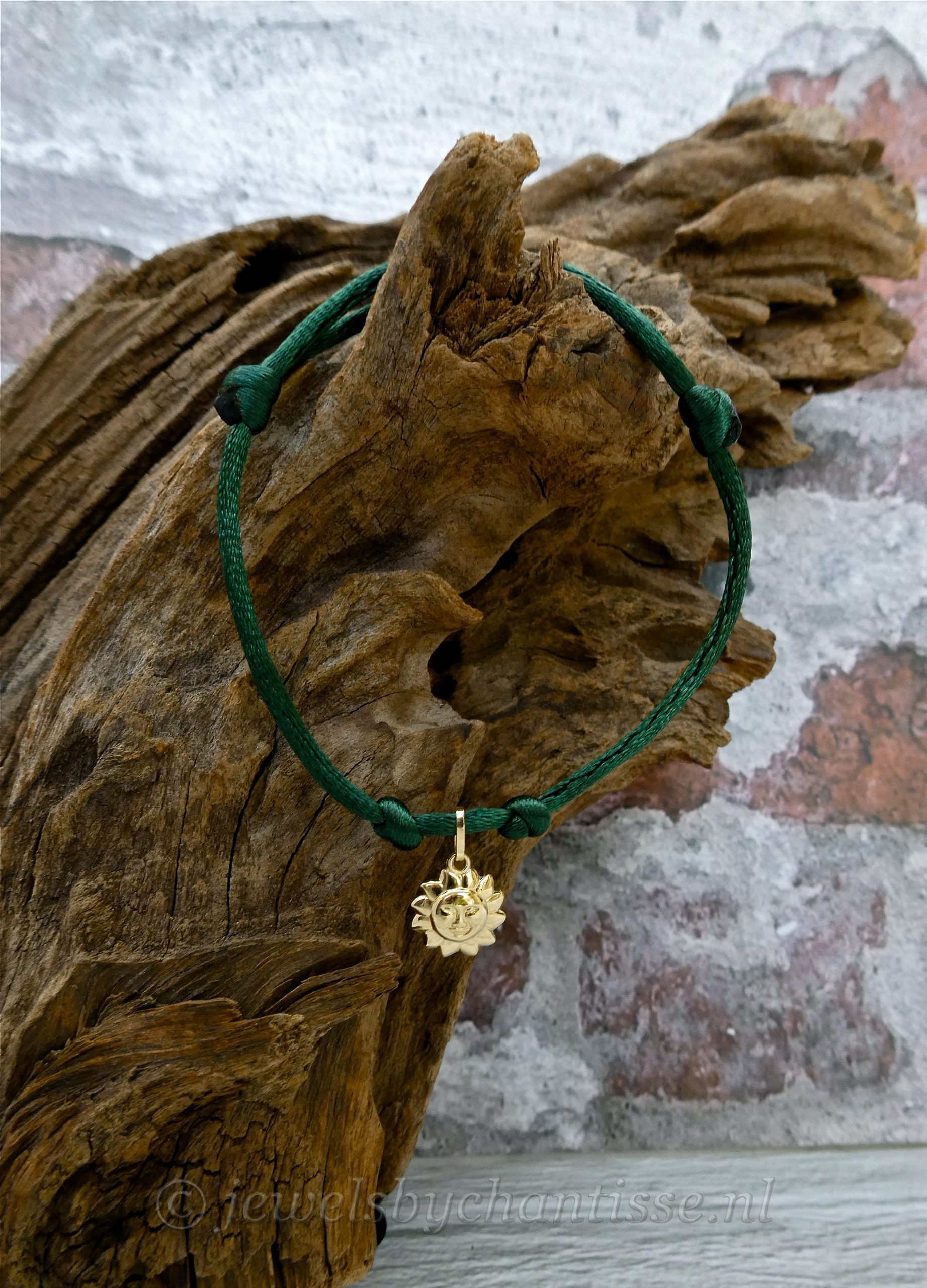Dit uniek groene 14 krt geelgouden zijde armbandje met een zonnetje met gezicht is in meerdere kleuren te verkrijgen. Door de knopen te verschuiven kun je het armbandje op maat maken. Wil je het in een andere kleur bestellen zoals lichtblauw, zwart, lichtgroen of roze, stuur een mailtje naar info@jewelsbychantisse of vul het contactformulier in.