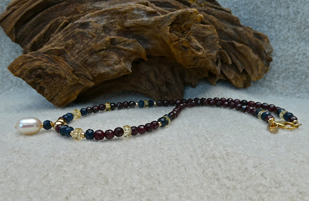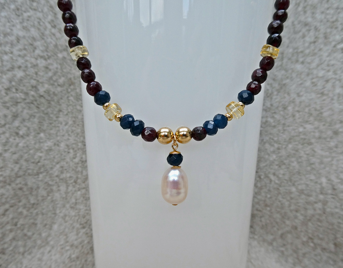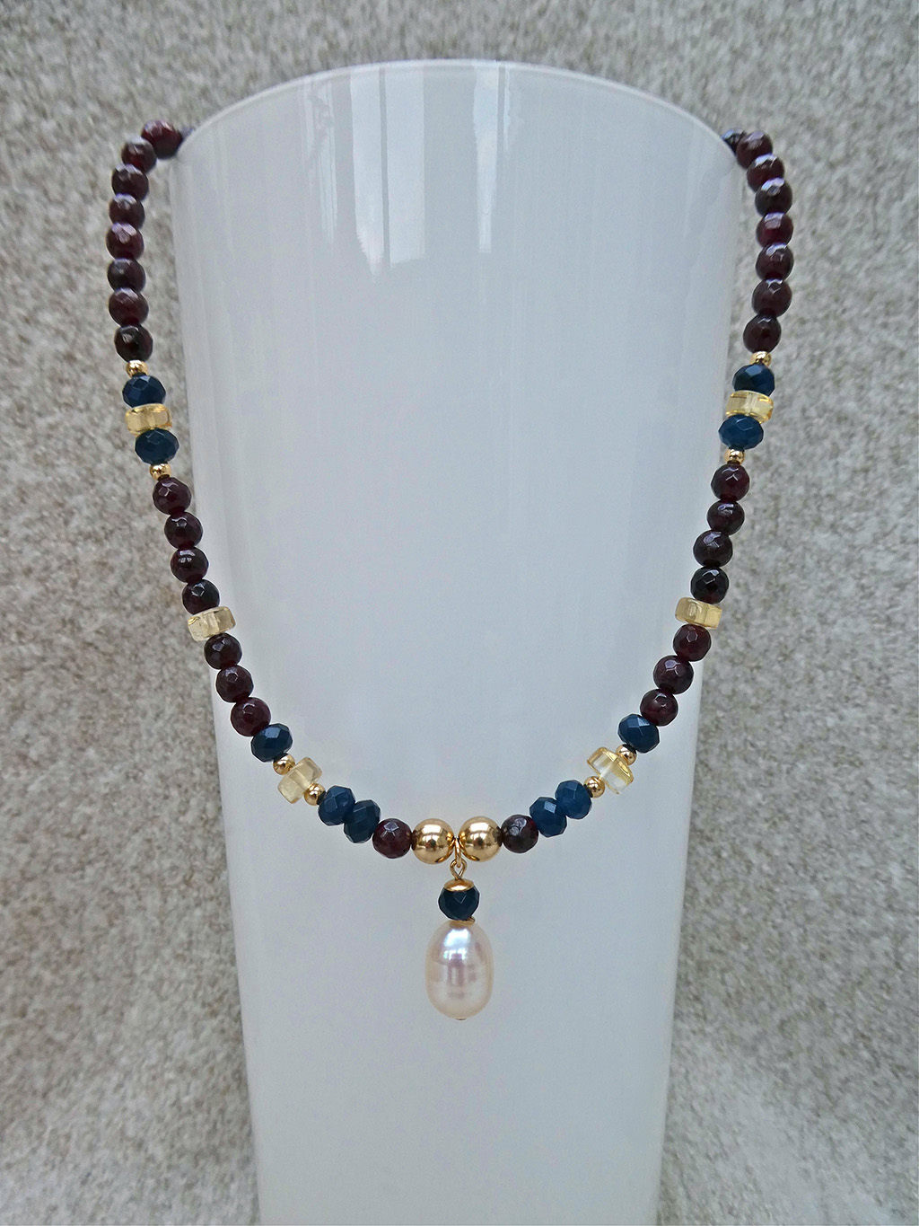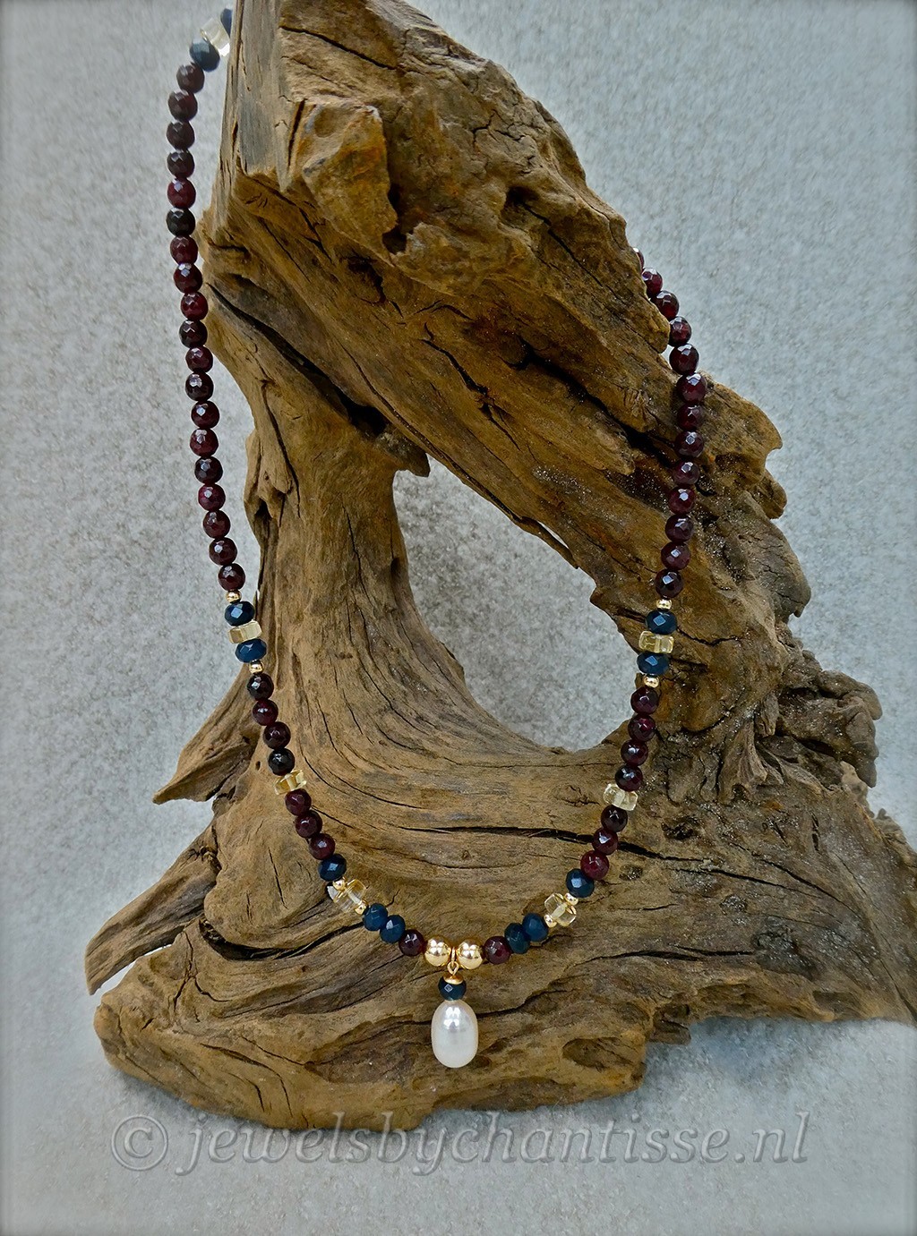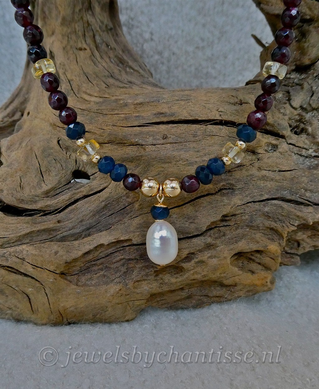 Schitterend eigentijds en tevens klassiek goldfilled collier van granaat, citrien en agaat. Het collier heeft een AA-kwaliteit ovale zoetwaterparel dat een mooi contrast geeft met het collier.