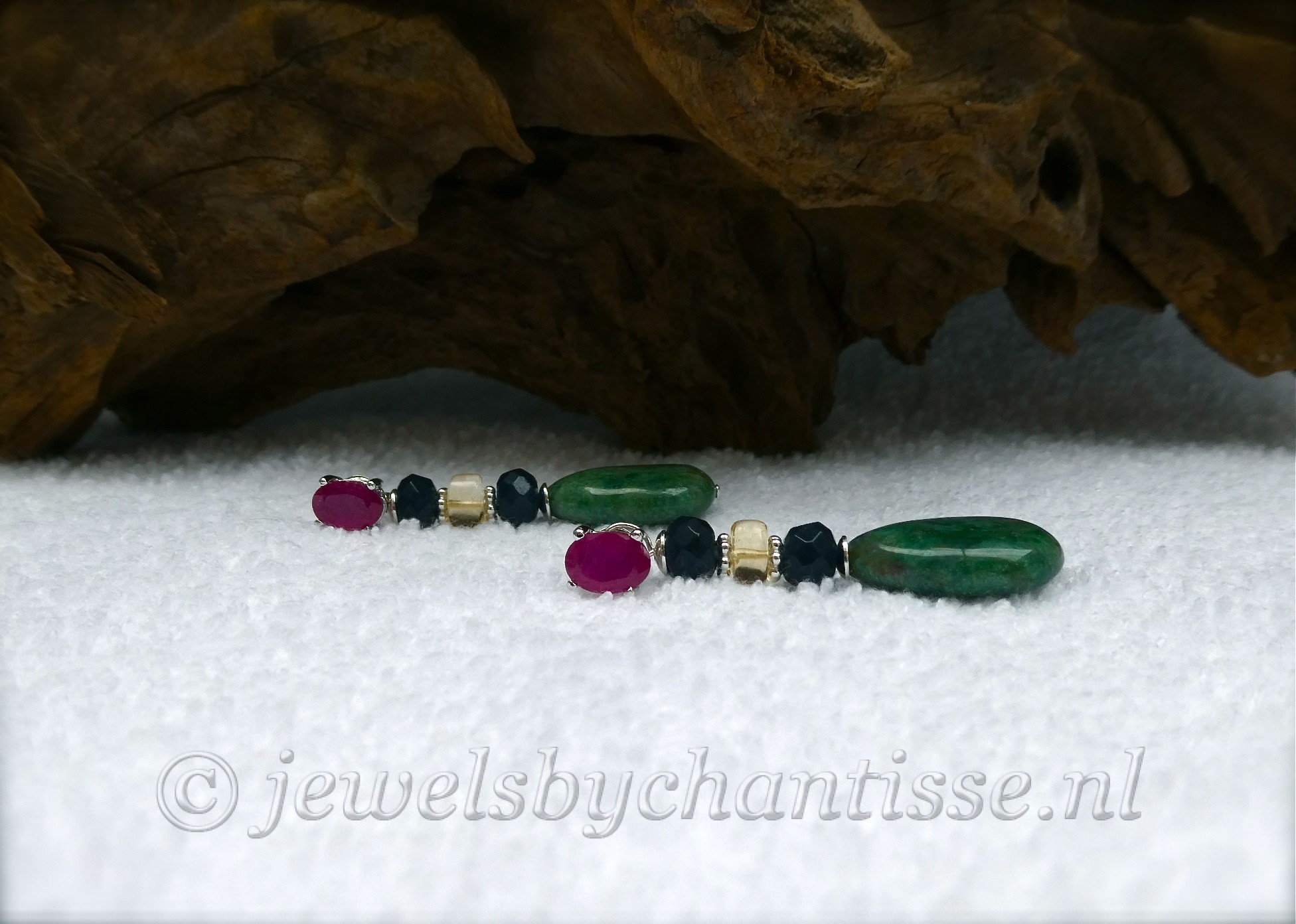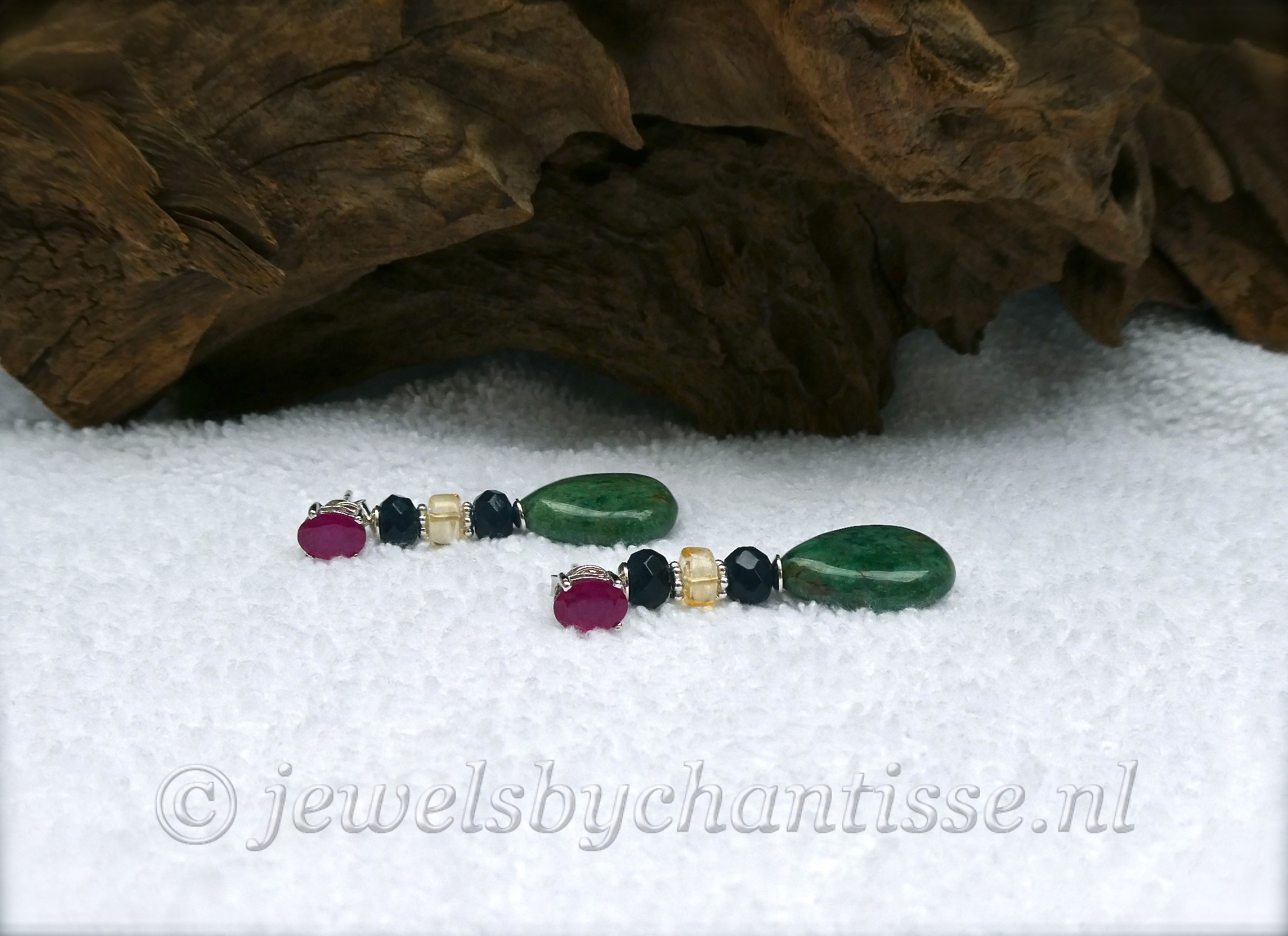 Zeer mooie sterling zilveren oorstekers met robijn en afneembare jaspishangers met citrien en facetgeslepen blauwe agaat. De oorstekers met robijn kunnen dus ook los worden gedragen. De jaspis edelsteen heeft een mooie groene geaderde kleur en is 18 x 13 mm groot. De citrien is transparant en helder geel van kleur. De robijnen zijn 7 x 5 mm groot. Het geheel heeft een lengte van 4,1 cm. Exclusieve oorbellen met een elegante en chique uitstraling.