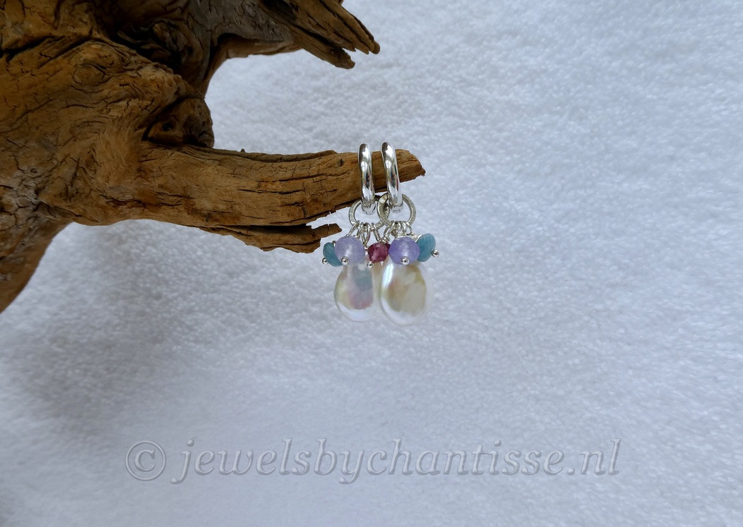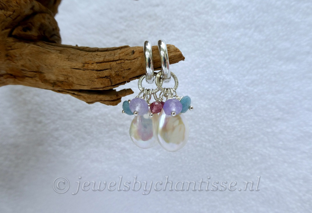 Unieke sterling zilveren oorbellen met barokparels die verfraaid zijn door verschillende kleuren toermalijn en agaat steentjes. Zowel de creolen als de barokparels zijn 15 mm groot en het geheel is ongeveer 4 cm lang. De creolen zijn ook los te dragen. Sfeervolle oorbellen die zowel gewoon of met een feestelijke gelegenheid te dragen zijn.