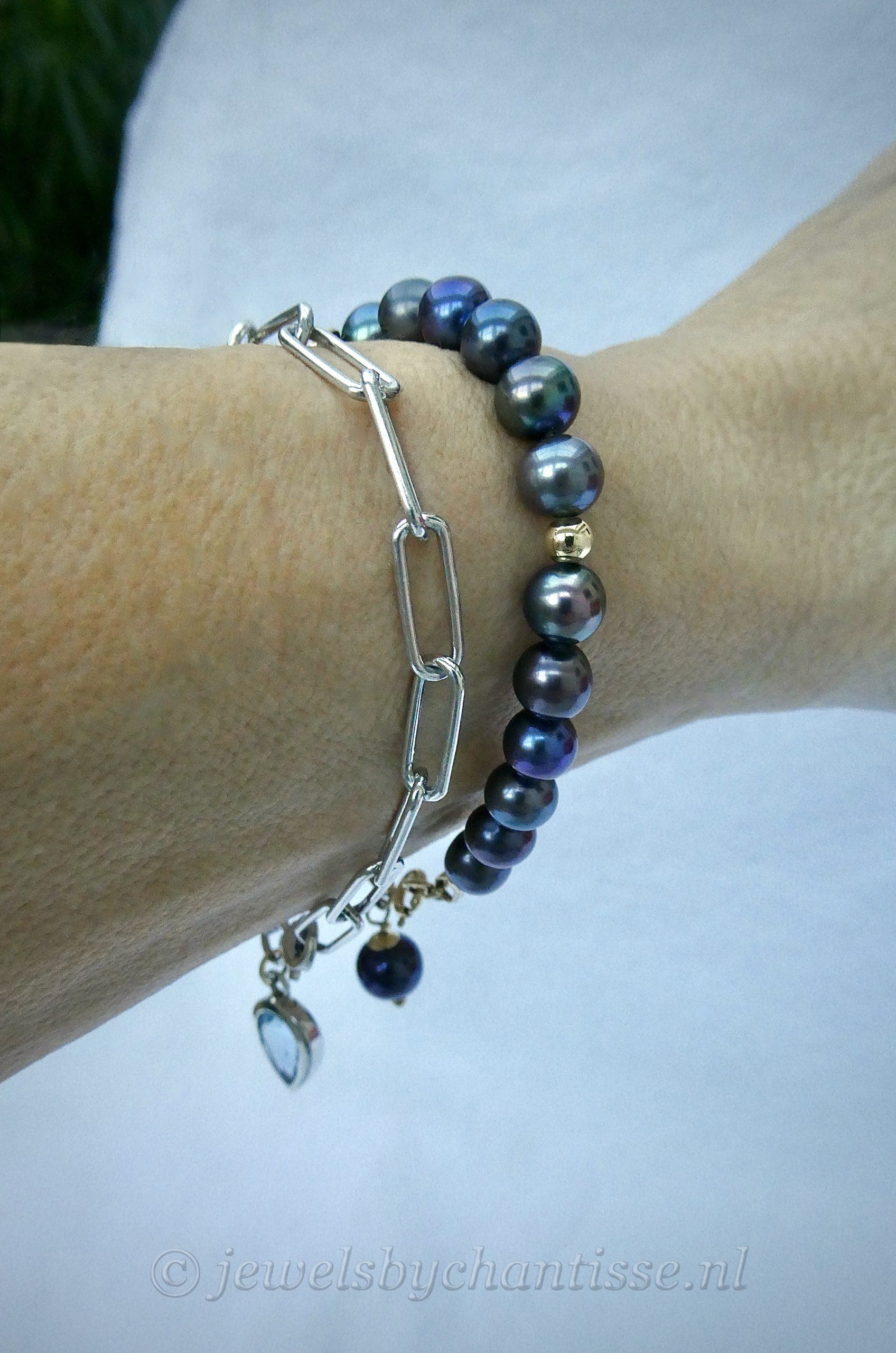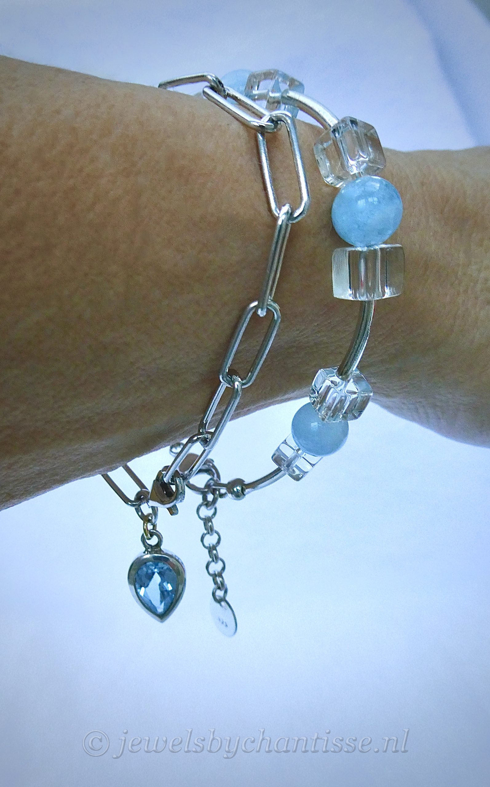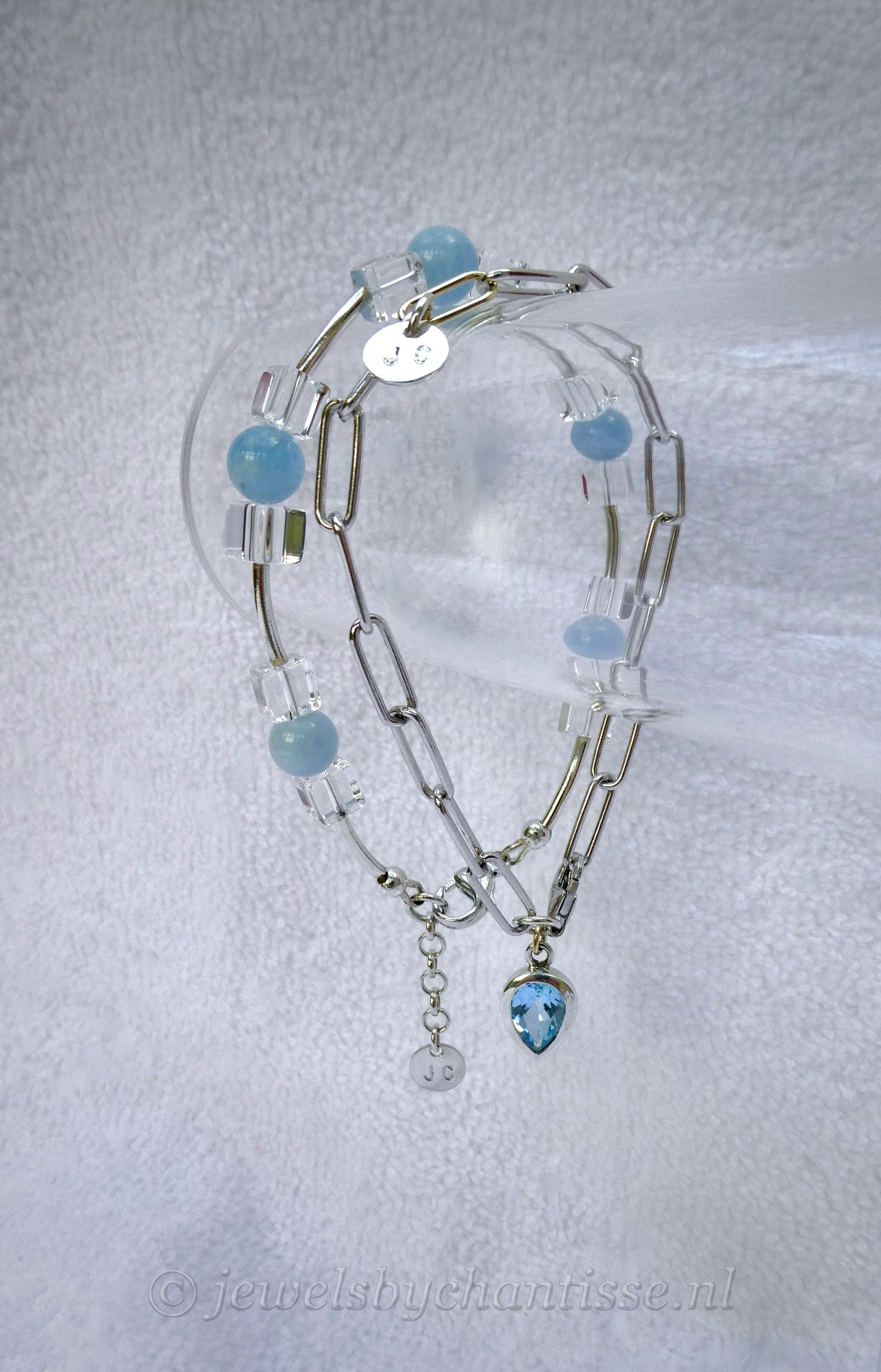 Mooie handgemaakte zilveren ‘paperclip’ armband met een 14 krt geelgouden schakel en oogje. De armband heeft een druppelvormige hanger met een facetgeslepen blauwe topaas. Aan de gouden schakel hangt het labeltje van Jewels by Chantisse. De armband is 19 cm lang en 5 mm breed. Deze armband is ook goed te dragen in combinatie met andere armbanden. (zie foto’s)