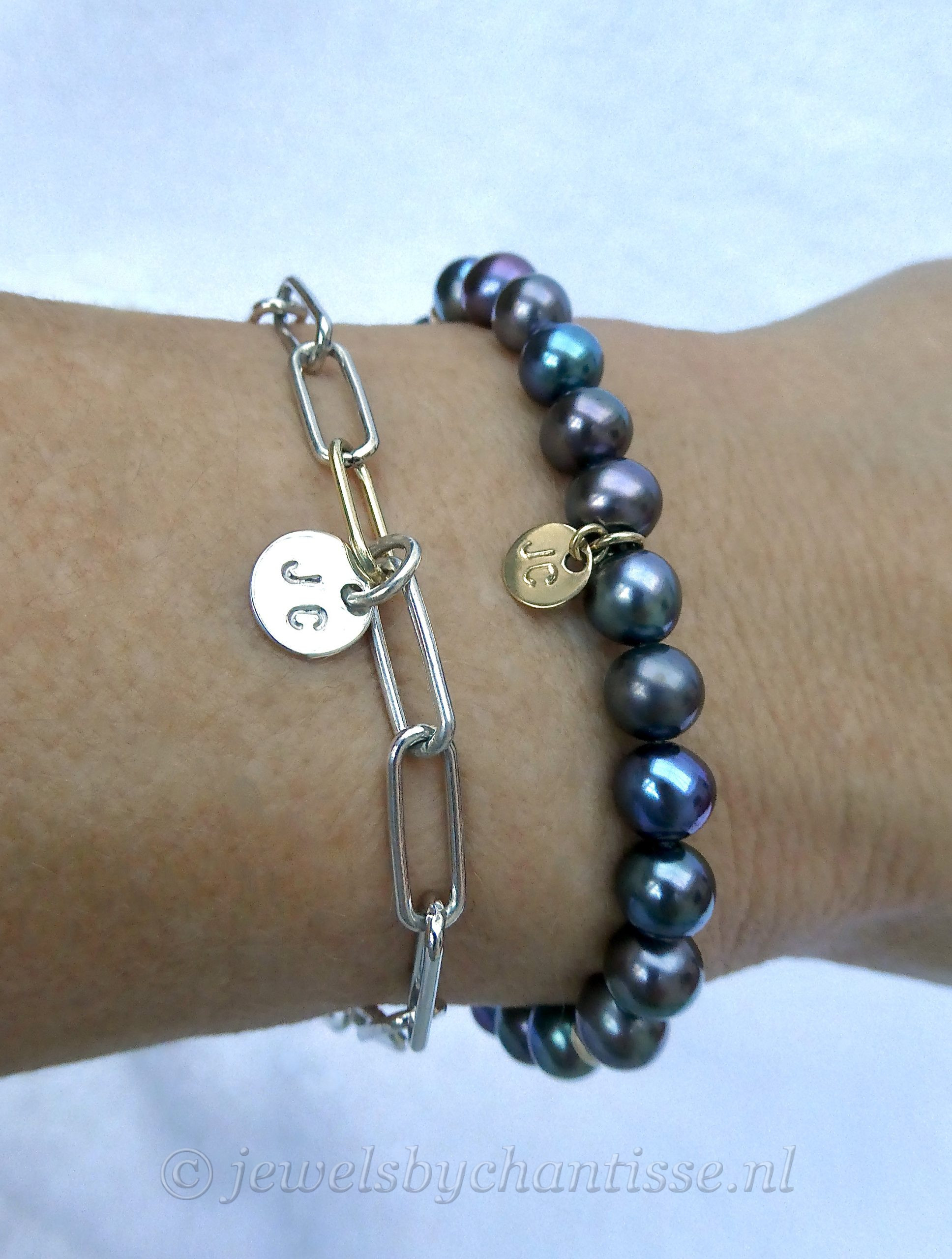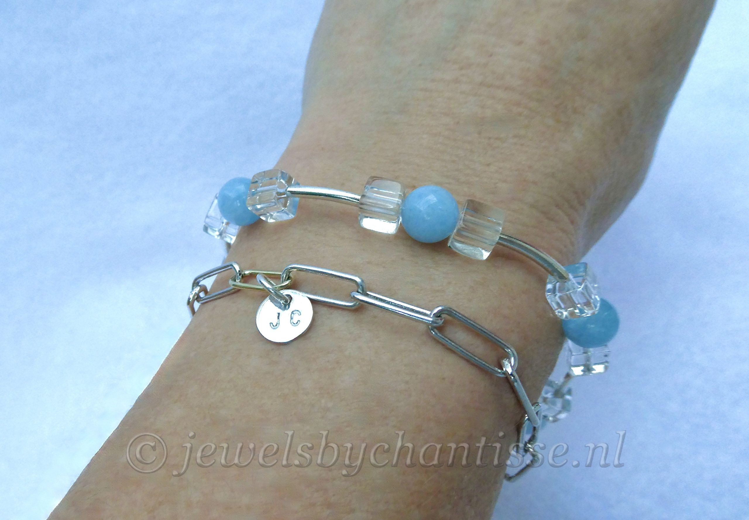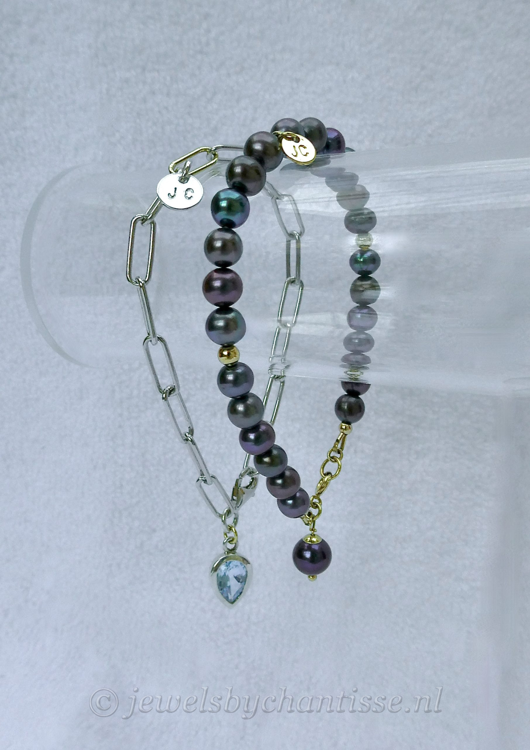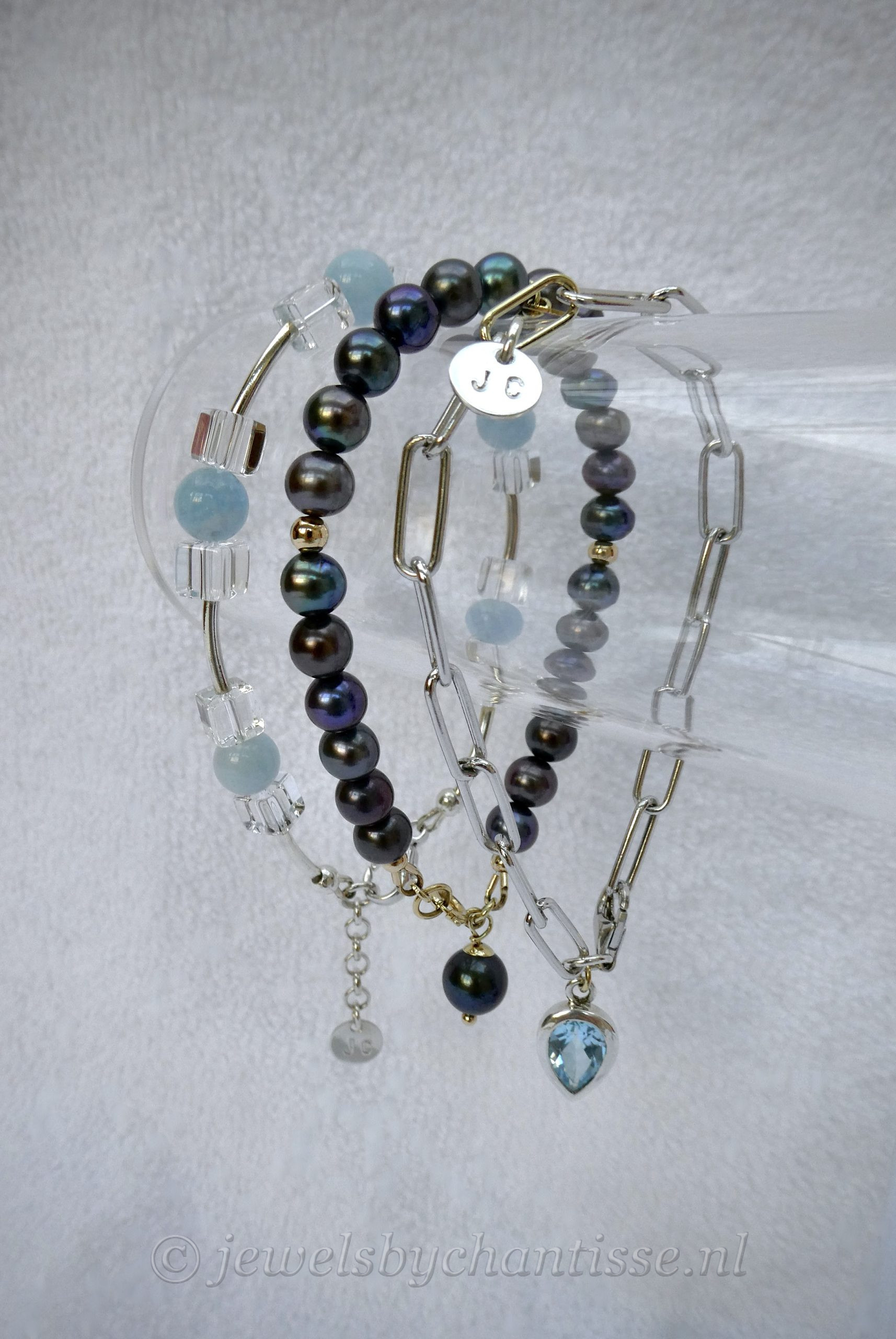 Mooie handgemaakte zilveren ‘paperclip’ armband met een 14 krt geelgouden schakel en oogje. De armband heeft een druppelvormige hanger met een facetgeslepen blauwe topaas. Aan de gouden schakel hangt het labeltje van Jewels by Chantisse. De armband is 19 cm lang en 5 mm breed. Deze armband is ook goed te dragen in combinatie met andere armbanden. (zie foto’s)