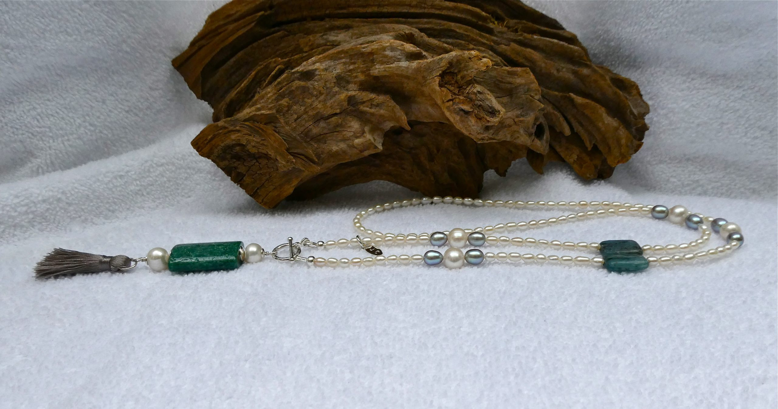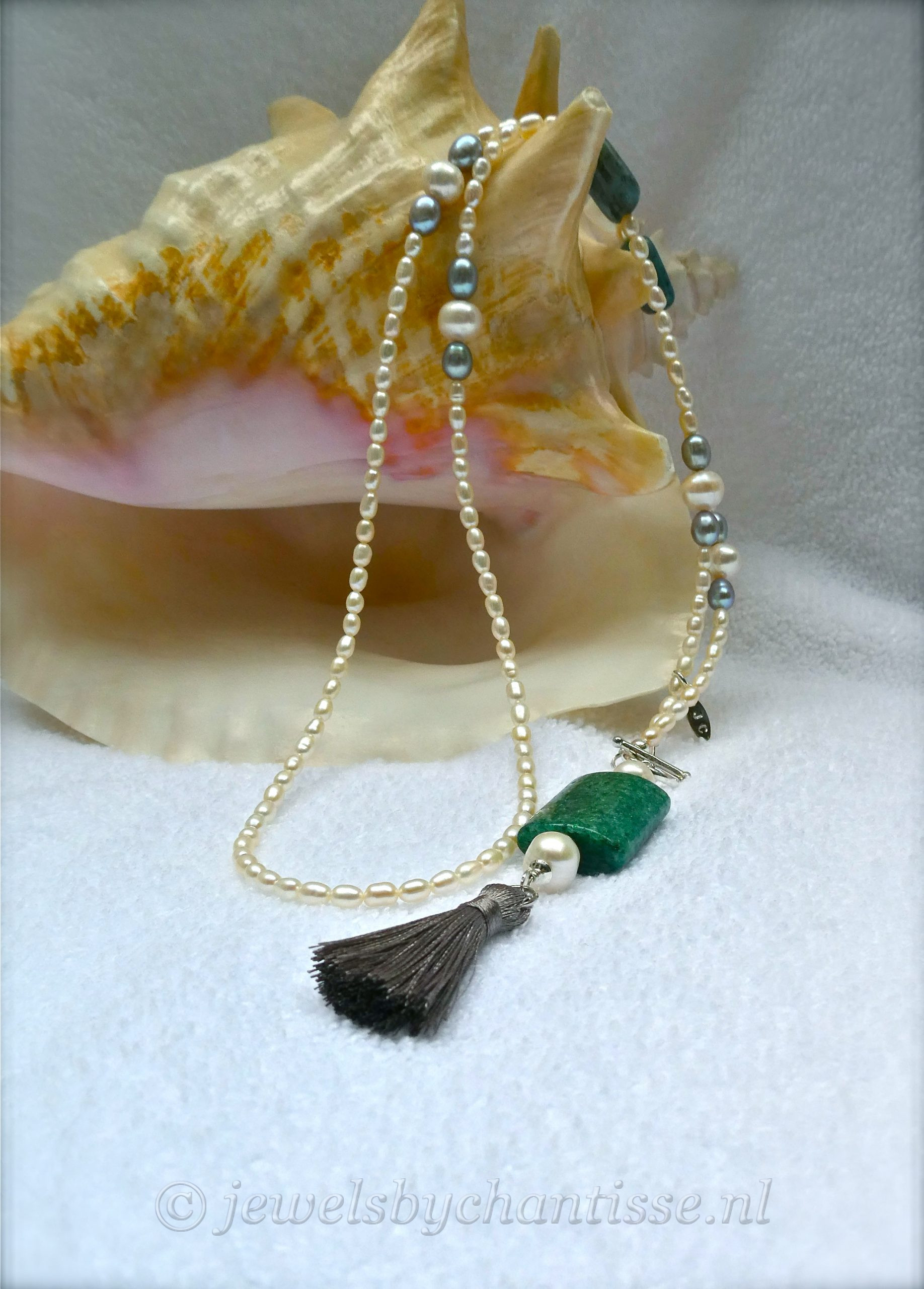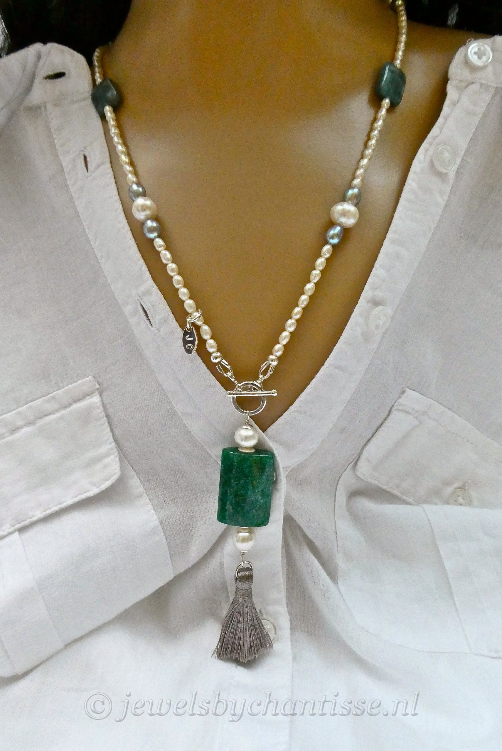 Mooie lange sterling zilveren witte parelketting met acht grijze parels, zes grotere witte parels een grote groene kwartsiet en blauw/groene kyaniet. Zowel de witte pareltjes als de grijze parels zijn van AA- kwaliteit. Je kunt de ketting zowel kort (dubbel) als lang dragen. (zie afbeeldingen) De ketting sluit dmv een bewerkt (gehamerd) kapittelslotje aan de voorkant waar tevens de groene kwartsiet met parels en flosje aanhangen. De ketting is 75 cm lang, de kleine pareltjes zijn 5 x 3,5 mm groot. een unieke handgemaakte ketting die erg leuk staat op een witte blouse, t-shirt of trui.